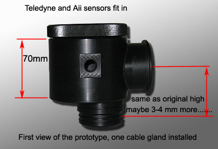 and ready 3 cell sensor house for the Apocalypse rebreather New picture will come It is made for Aii and Teledyn sensors By exchanging this house to the original 90 degree elbow you won´t notice any difference in hose lenght. The lower connection is made out of center, so is it as small as possible. cable gland is 90 degre to hose. two cable glands, no problem. Standard we always drill M12x1,5 as the blue globe cable glands are just the best and only available in metric