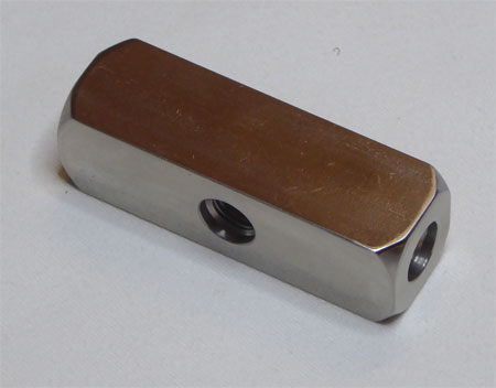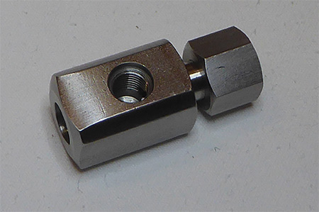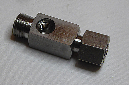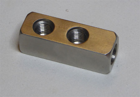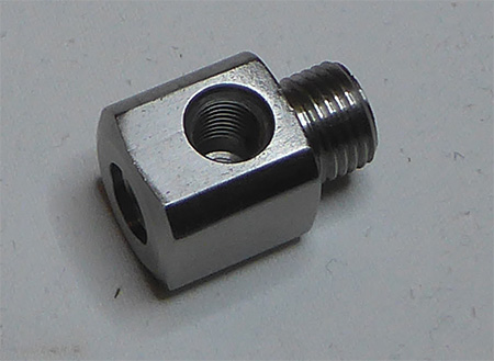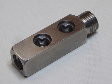 Adapter/Distributor top: 2x 3/8 UNF female (or 9/16 female if inlet is is unscrewed) bottom: 1x 9/16 UNF female with nut