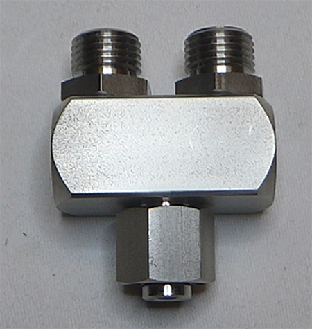 Adapter/Distributor female 9/16 to 2 female 3/8 There is enough room to connect a flowstop or a Swagelog fitting ---or other things |